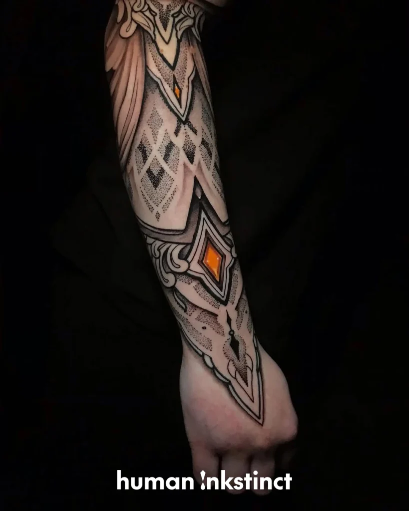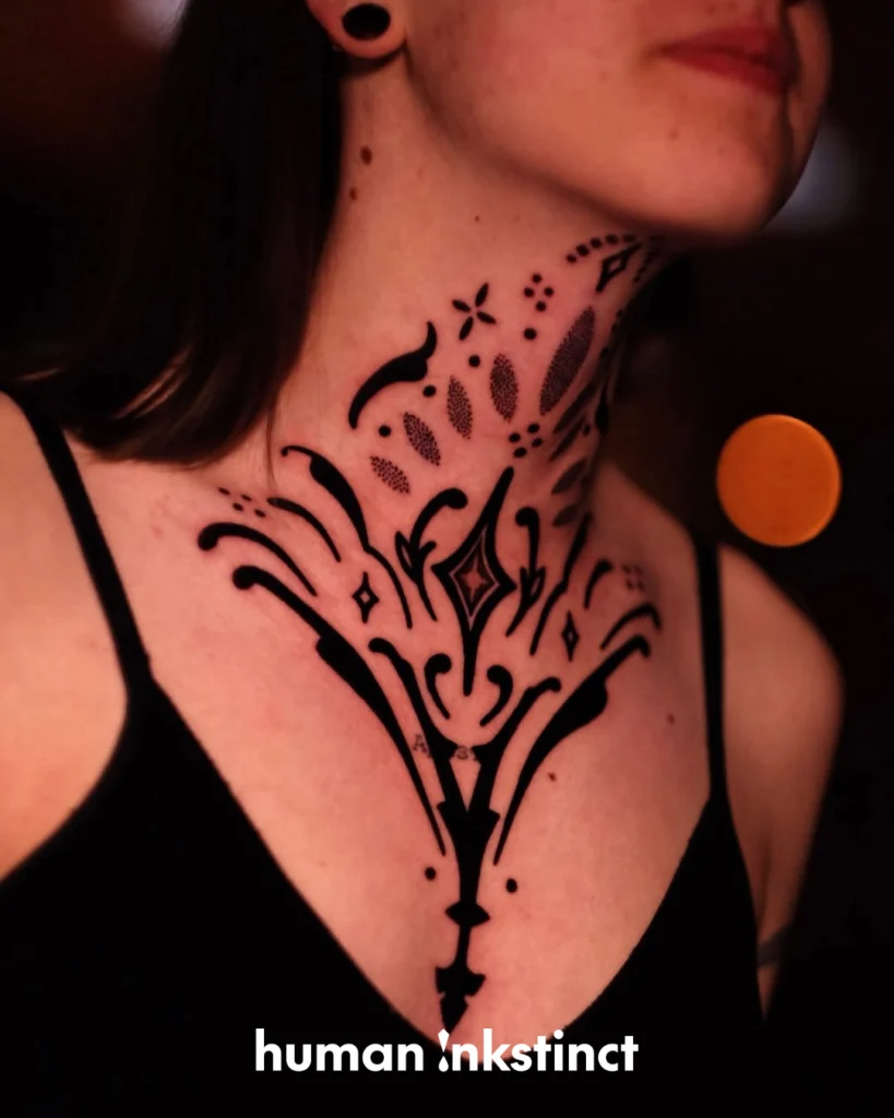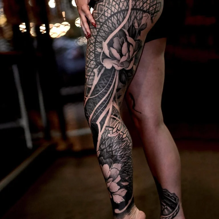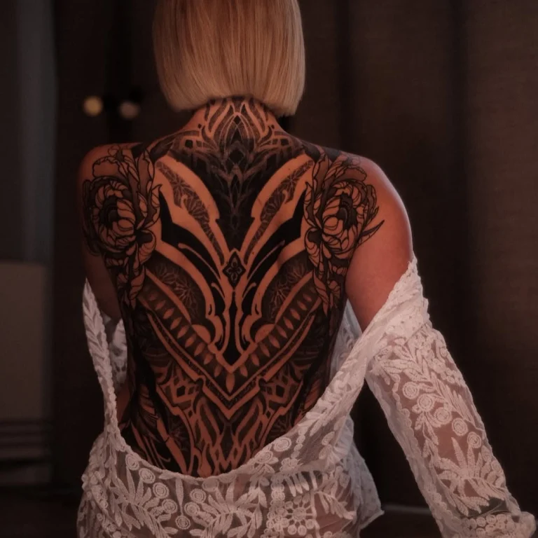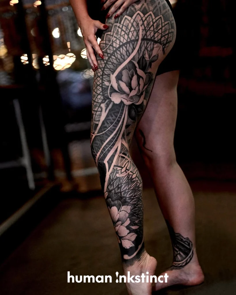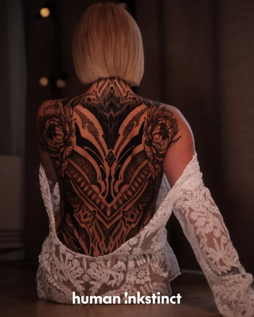 Charakteristisch für Alex’ Stil sind symmetrische, architektonisch aufgebaute Kompositionen, die sich fließend an Schulter, Arm, Rücken oder Bein anschmiegen. Dabei kombiniert er kraftvolle schwarze Flächen mit feinen Mustern, Negativräumen und rhythmischen Strukturen – Tattoos mit enormer Tiefe, Klarheit und visueller Stärke.