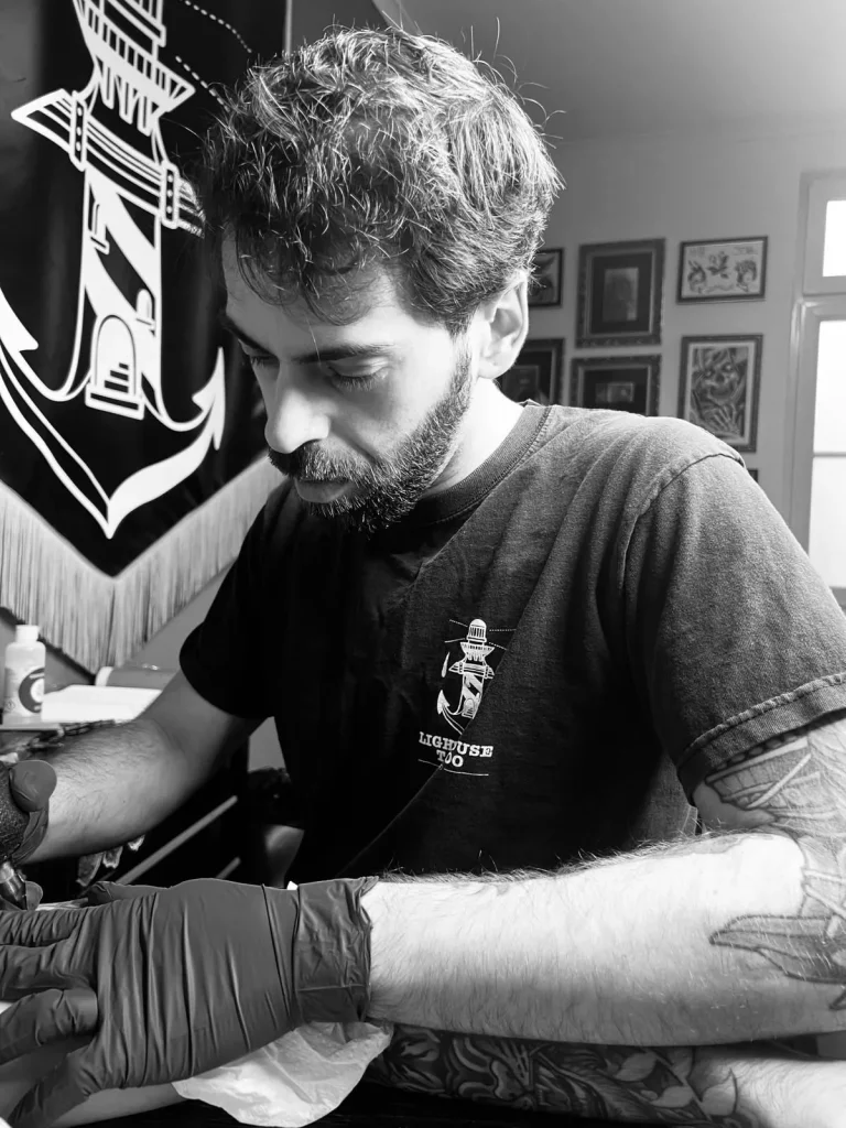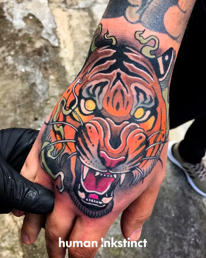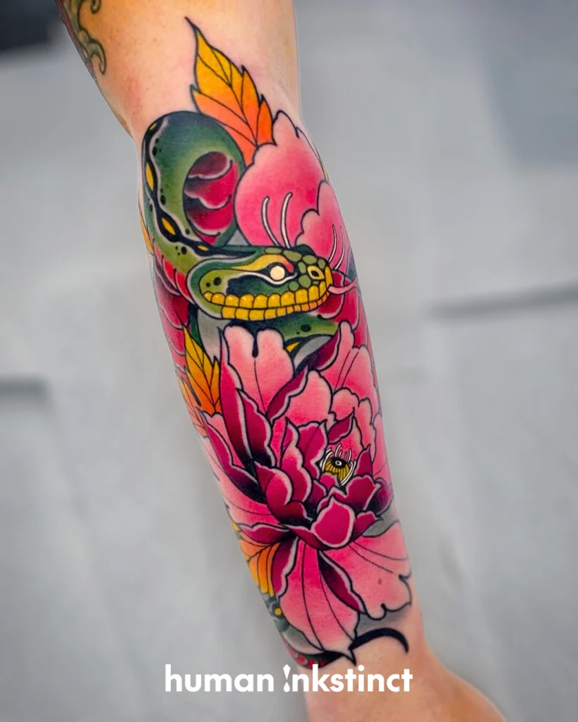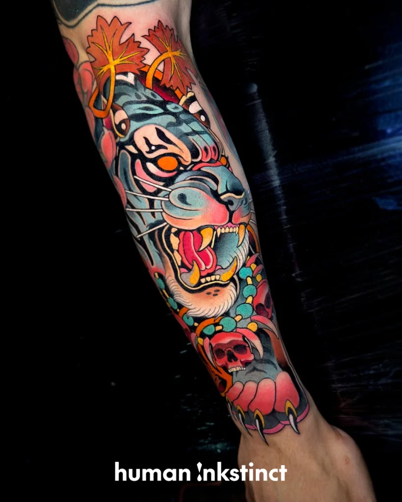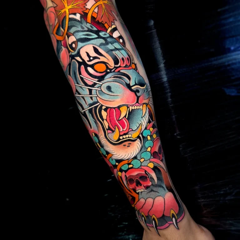 Sein Stil lebt von kraftvollen Motiven: Besonders häufig stehen Tiere, Portraits und symbolstarke Designs im Mittelpunkt – oft kombiniert mit floralen Elementen oder dynamischen Kompositionen, die den Körper perfekt mit einbeziehen. Genau diese Balance aus „bold & clean“ sorgt dafür, dass seine Tattoos nicht nur in Fotos, sondern vor allem auch auf der Haut langfristig stark und hochwertig wirken.