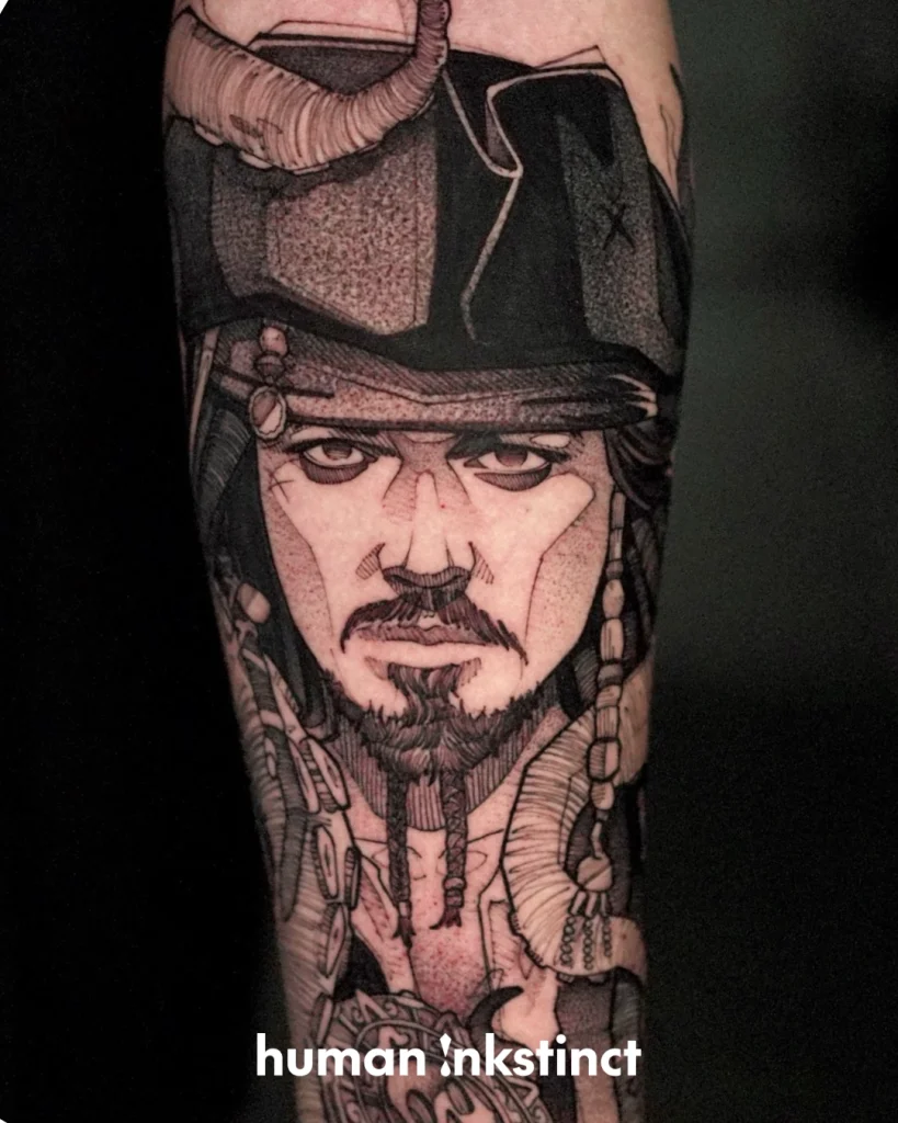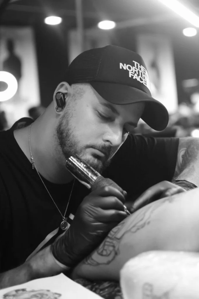 Guilherme bewegt sich klar im Sketchart- und Graphic-Bereich und steht für einen ausdrucksstarken, rohen Stil, der bewusst mit Linien, Texturen und Kontrasten spielt. Seine Tattoos wirken wie gezeichnete Momentaufnahmen – dynamisch, kantig und voller Energie.