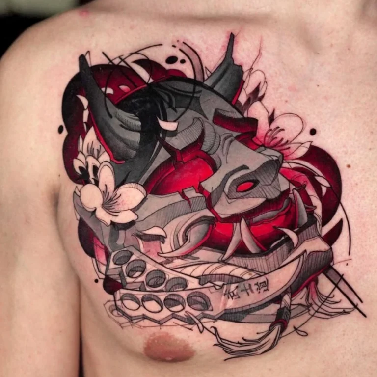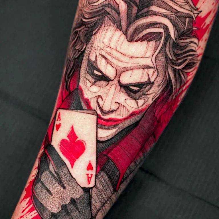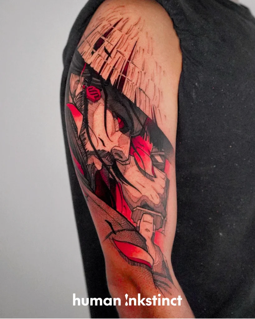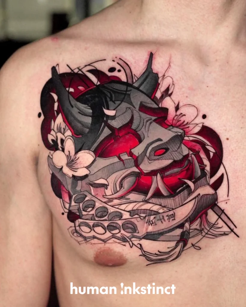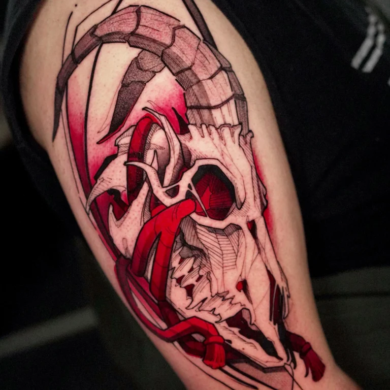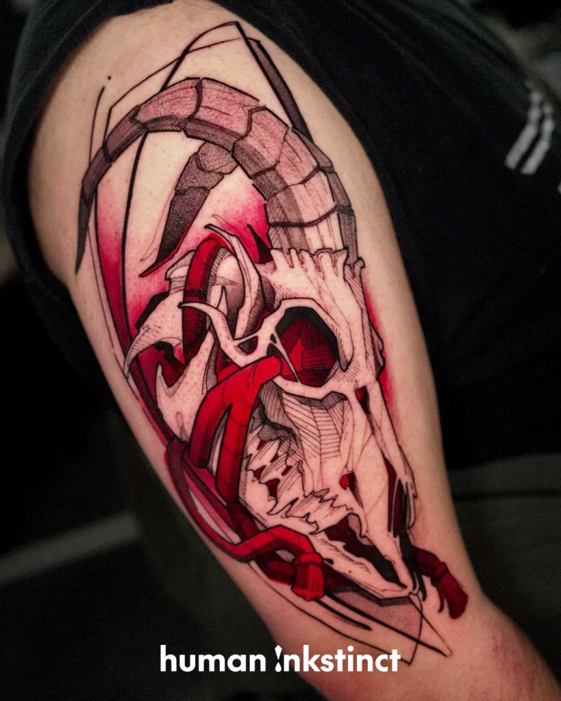 Typisch für Guilhermes Arbeiten ist die Kombination aus grafischen Linien, punktierten Schattierungen und bewusst fragmentierten Flächen, die den Motiven eine lebendige, fast aggressive Bewegung verleihen. Ergänzt wird dieser Look durch intensive Farbakzente, vor allem in Rot- und Orangetönen, die gezielt eingesetzt werden und den Tattoos eine starke visuelle Präsenz geben.