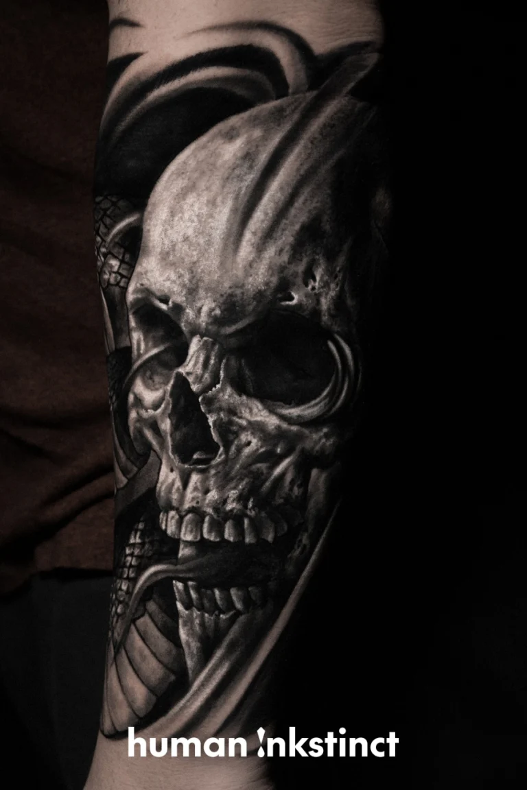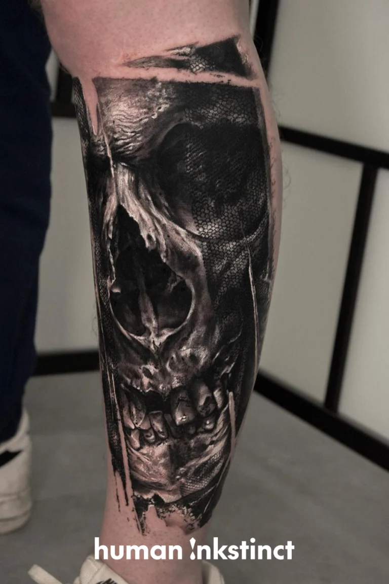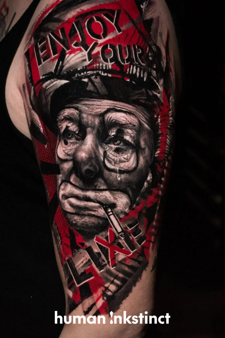 Realistic-Tattoos mit düsterem Flair und Trash Polka-Elementen