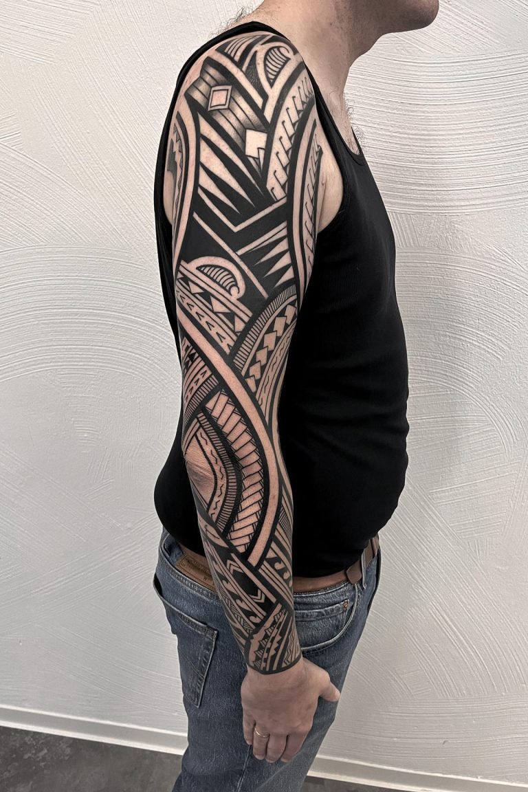 Tätowierer für polynesische Tattoos – wie die Artists aus unserem Studio – bringen nicht nur technisches Können mit, sondern auch kulturelles Verständnis. Linienführung, Rhythmus und Flächenaufteilung müssen perfekt zusammenspielen. Zudem ist Erfahrung mit großflächigen Projekten entscheidend. So entsteht ein stimmiges Gesamtbild.