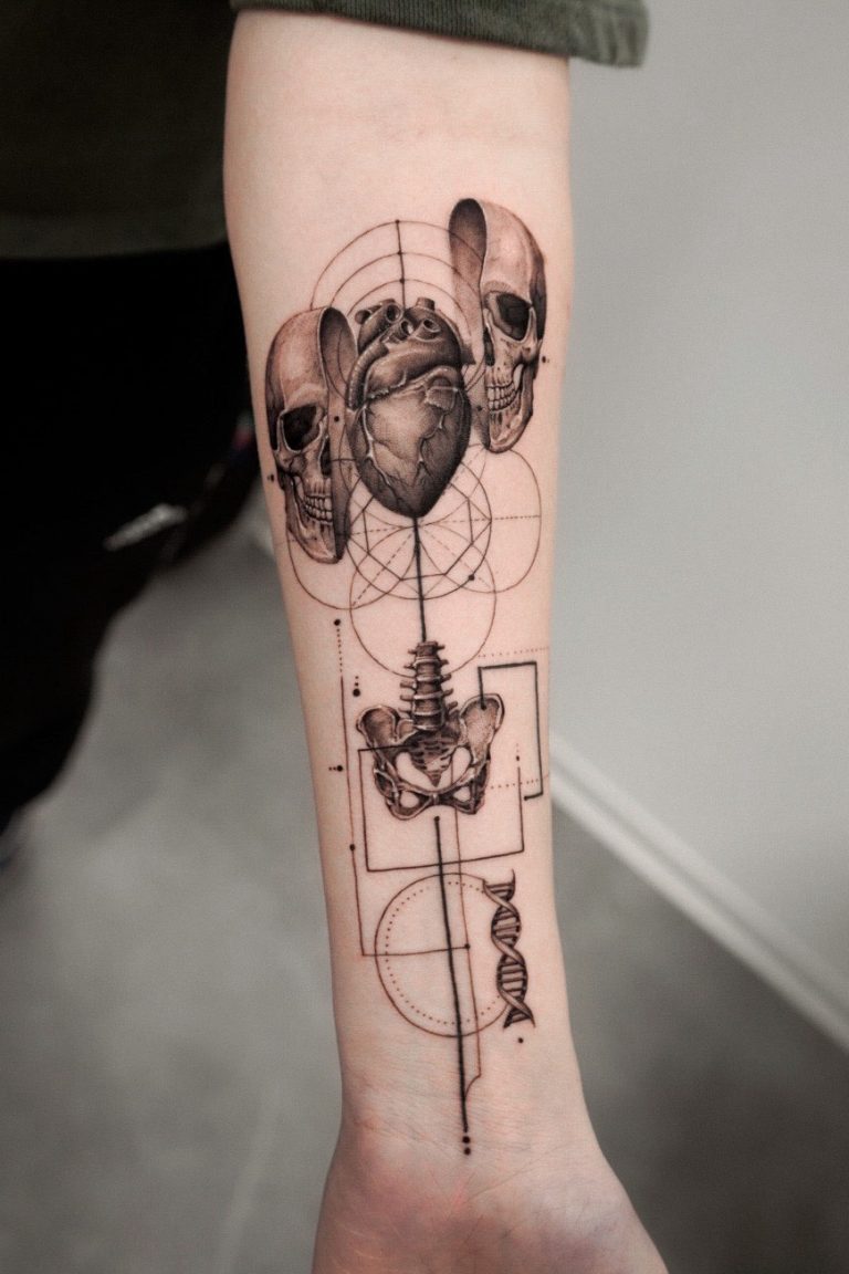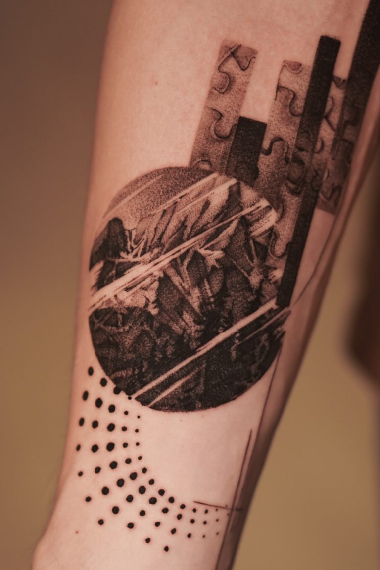 Micro-Realism-Tattoos sind extrem detaillierte und realistische Tattoos, die in sehr kleinem Maßstab ausgeführt werden und durch geometrische Formen und Linien ergänzt ein Gesamtkunstwerk erzeugen. Dies ermöglicht die ästhetische Kombination von Motiven, die thematisch teilweise weit auseinanderliegen.